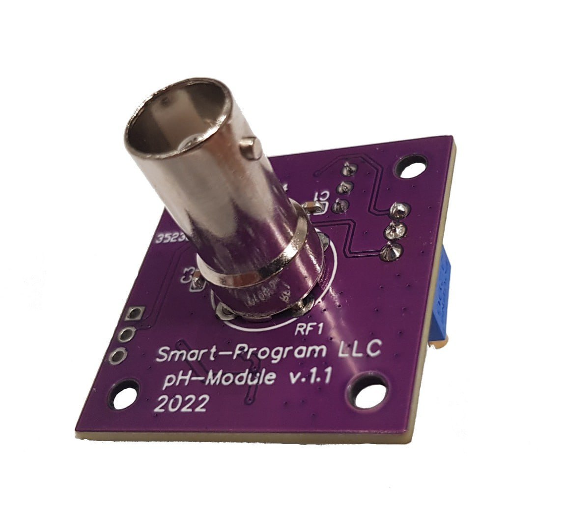Модуль предназначен для преобразования сигнала с pH-зонда в аналоговое напряжение пропорциональное уровню pH. Модуль имеет подстроечные резисторы для подстройки крутизны характеристики и нуля.